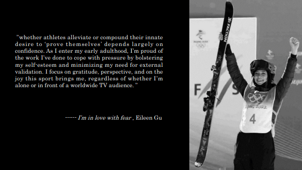 青蛙公主谷爱凌是一个绝佳的例子。她发表在《纽约时报》上的那篇小作文,就描述了她作为运动员是如何拥有内在强大的自信心帮助自己突破,以及学会如何减少自我评价中对外在认可的依赖。