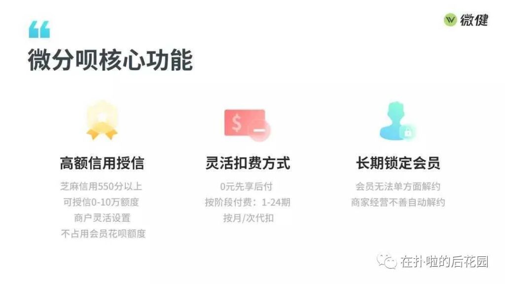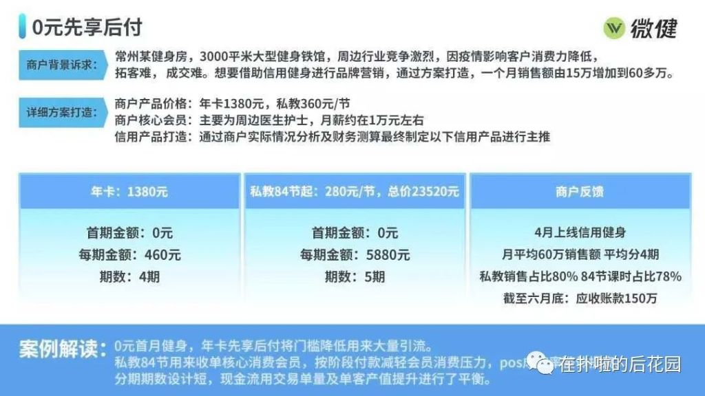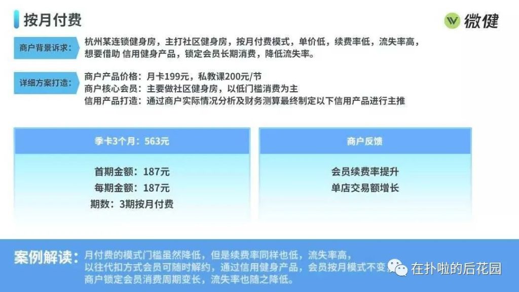 这个产品的特点是根据用户的芝麻信用进行分期额度授信,分期后会员已月付,季付的方式付款,会员不能单方面终止协议,支付宝会以分期方案自动扣费。这种做法巧妙地规避了健身房不能收取大额预付费的政策红线,变现通过分期将小单变大单。